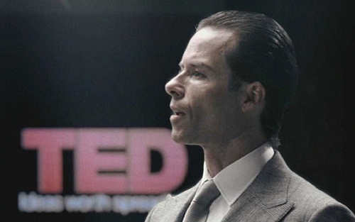 The clip features Guy Pearce in character as Peter Weyland, founder of the company that will presumably become Weyland-Yutani, the sinister corporation ever-present in the background of the other films in the series. Weyland is giving a speech at a future version of the TED conference, taking place in 2023 – sixty-two years before the setting of Prometheus. In front of an enraptured audience, Weyland (in a plummy English accent which some have considered to be an attempted impression of John Hurt) extols the virtue of humanity’s technological development, making a brief mention of the androids which appear in Alien and its sequels. The creation of such life-forms, he claims, signals humanity’s ascent to godhood. This small glimpse of Weyland’s possibly delusional nature unsettles the onscreen audience, and shifts the tone of the clip to a more sinister atmosphere. Weyland then concludes his speech with talk of his unlimited ambition and unstoppable drive to change the world.